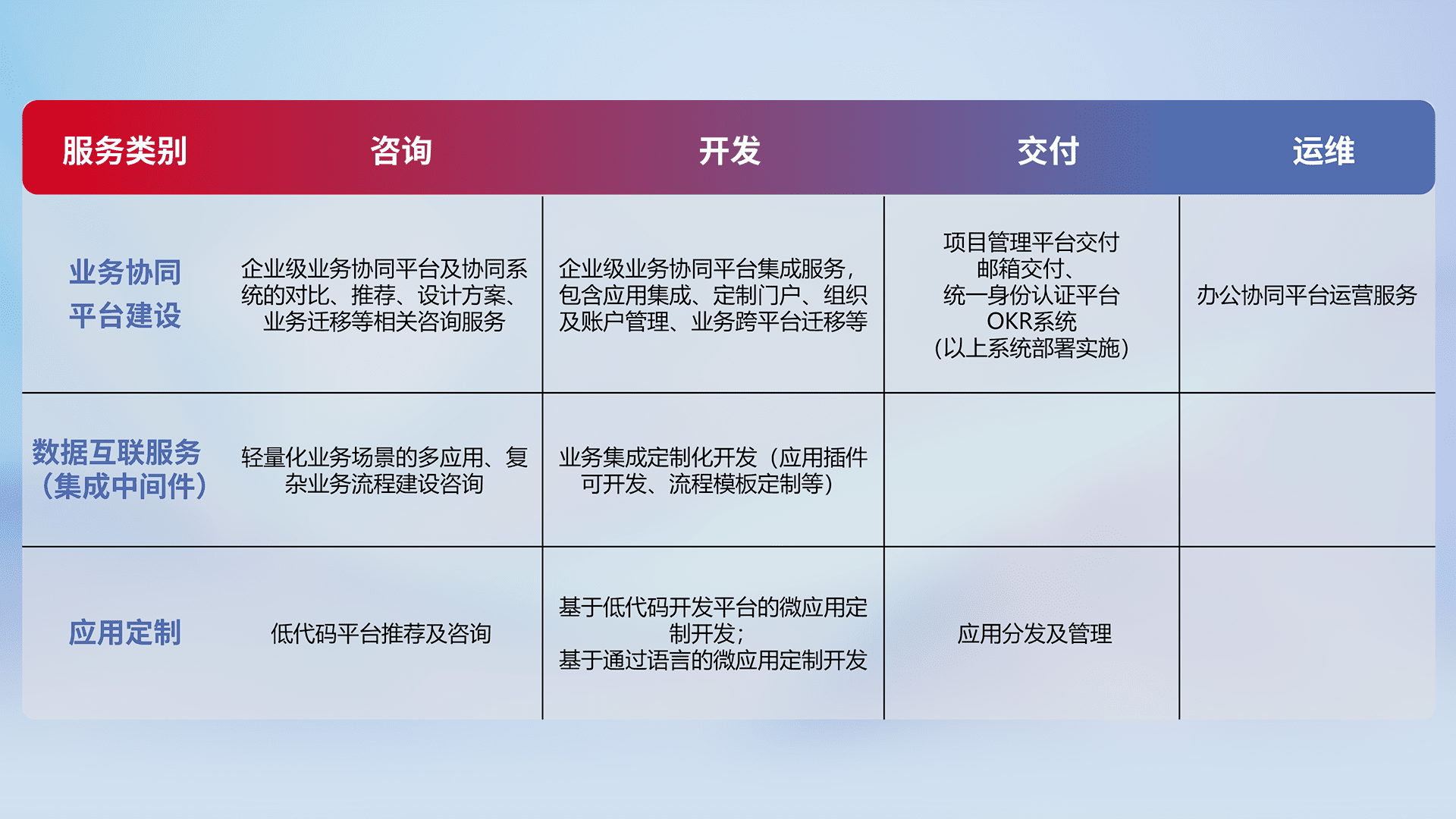 针对钉钉、、企微、、、、IDaas等平台级产品提供产品的规划、、、、方案、、交付、、定制化开发等服务,,实现如统一协同办公、、、智能客户服务、、混合会议管理、、智能数据查询、、、、等业务场景,,,实现数字化转型。。。