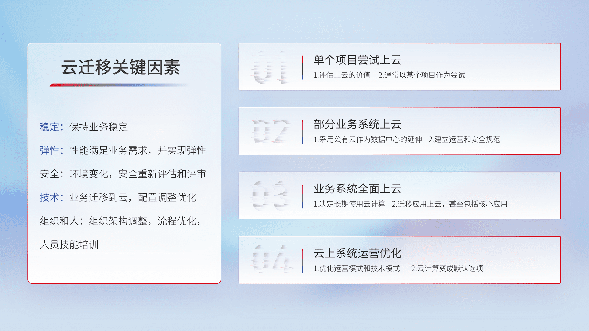 结合实际业务,,从规划设计、、云平台选型、、云原生改造、、数据迁移、、、、集成交付,,迁移全过程为客户识别最佳上云路径,,,,做好风险识别管理,,设计网络架构、、、身份权限、、安全审计合规、、、、操作审计、、、、日志审计、、、监控告警策略、、、多站点容灾设计等,,对云上基础设施进行整体规划,,,提升IT治理水平,,以满足弹性、、高可用、、、高性能的需求。。